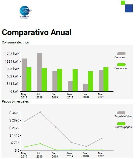 Una vez que se logra producir la misma cantidad de electricidad con los paneles que la que se consume durante el año en la residencia, solamente se debe pagar a CFE una cuota bimestral ($49 pesos) por el hecho de tener una conexión eléctrica disponible para entregar la energía excedente durante el día y para recibir la energía requerida durante la noche. En la imagen se puede observar cómo, instalando paneles solares, se puede llegar al equilibrio entre la electricidad consumida y la producida y con esto reducir al mínimo los pagos bimestrales.